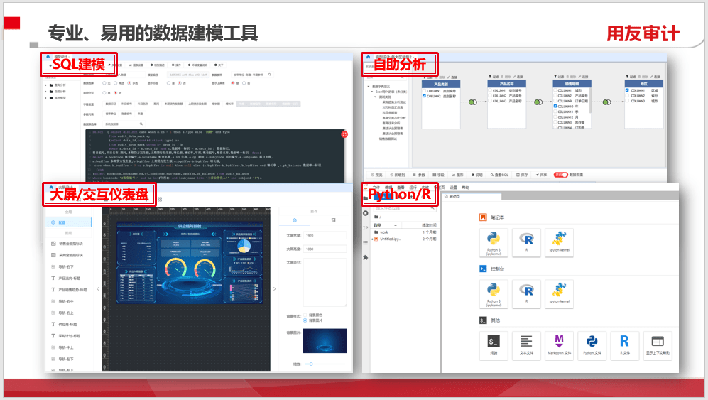 大數據時代,如何能將審計工作從“經驗驅動”變為“數據驅動”,周建婕表示數據分析系統是為企業、行政事業單位的內部審計人員及領導提供的一款集數據采集、數據建模、數據分析及指標監控預警于一體的數據審計產品。系統支持離線與在線數據采集,實現業財數據關聯與集中管理;系統提供拖拽點選式建模工具,方便審計業務人員自助分析;系統也提供SQL建模工具,可以利用SQL創建分析模型,系統內置10余項查詢分析功能及覆蓋預算、資金、資產、往來、收支等100余個分析模型,實現審計經驗的沉淀;另外,系統提供大屏/交互儀表盤,創建各類炫酷的大屏效果,方便決策分析。系統支持創建預警指標及模型,自動將查詢出的數據推送給審計人員,便于直接關注風險疑點,確定審計重點,提供審計效率,提高審計工作質量;系統支持生成風險監控報告,對各個單位的風險問題進行集中反映,方便領導監督和決策。