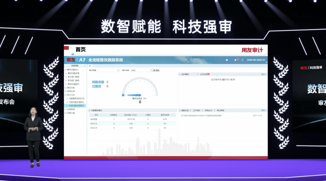 用友審計咨詢專家周建婕表示,用友審計秉持與用戶共創共享、相伴成長的研發理念,持續優化產品,推出“審友A7-數智化審計平臺”,為內部審計工作提供完整的業務解決方案。該平臺包括:審計管理、在線作業、決策支持、現場審計、遠程協同、數據分析預警、內控評價、工程審計、全流程整改跟蹤、監督追責、投資項目審計、審友云十二大核心子系統。具有“整體規劃、分步實施、快速見效、可分可合、無縫銜接”的特點。